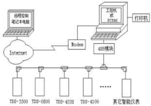 操作站到適配器之間采用高速串行或多串口通信。傳輸距離不大于20米。適配器到儀表之間采用RS485總線網(wǎng)絡(luò)型或RS232一一對應(yīng)輻射型。傳輸距離不大于1500米。