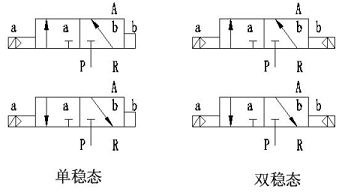 閥體兩端各有一個(gè)控制腔,兩個(gè)控制腔各有一個(gè)Φ2mm的先導(dǎo)孔與氣源壓力口(接口“P” )相通,氣源氣由先導(dǎo)閥來(lái)控制進(jìn)入控制腔(接口“A” )。當(dāng)一端線圈通電,磁力作用打開先導(dǎo)閥,氣源氣進(jìn)入該端控制腔(接口“A” ),推動(dòng)活塞帶動(dòng)閥芯,改變工作狀態(tài)。閥體有單穩(wěn)態(tài)和雙穩(wěn)態(tài)兩種,單穩(wěn)態(tài)閥線圈只有長(zhǎng)期通電,電磁閥才能保持狀態(tài),一旦掉電,馬上復(fù)位。雙穩(wěn)態(tài)閥一旦線圈通電,閥位狀態(tài)改變后,即使掉電,仍保持現(xiàn)狀不變,只有當(dāng)一端線圈通電時(shí),閥位才會(huì)發(fā)生變化。