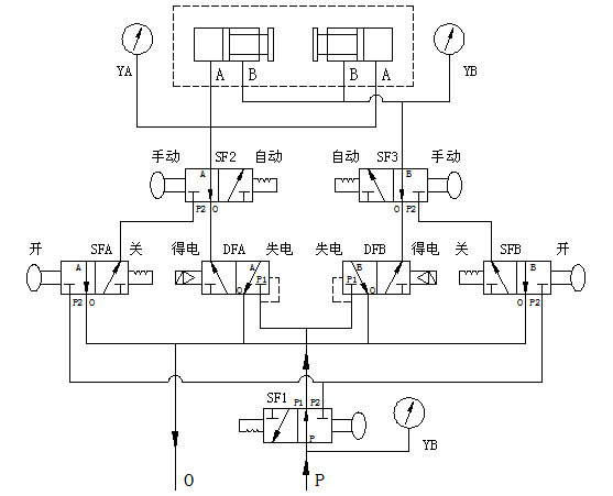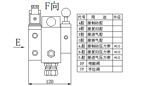 自動(dòng)剎車(chē):電磁閥線圈處于失電狀態(tài),手拉閥SF1、SF2、SF3往里推至自動(dòng)狀態(tài),過(guò)濾后壓縮氣體從進(jìn)氣腔(P腔)進(jìn)入集成塊。當(dāng)接收到停機(jī)指令時(shí),制動(dòng)電磁閥DFA得電開(kāi)閥,使壓縮氣體進(jìn)入制動(dòng)腔(A腔), 從而實(shí)現(xiàn)對(duì)制動(dòng)器的投入, 加速機(jī)組的制動(dòng)停機(jī);