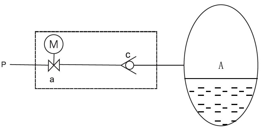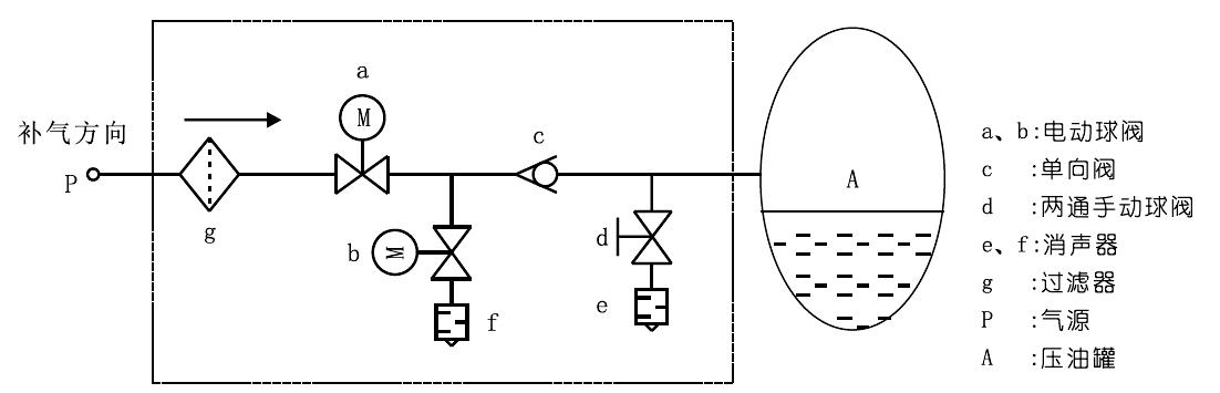自動補氣:當自動補氣條件滿足時,關閉電動球閥b,打開電動球閥a,補氣過程:高壓氣氣源P→過濾器g→單向閥c→壓油灌A補氣。